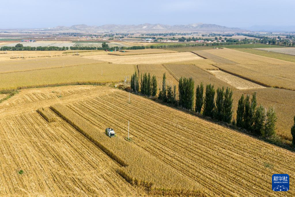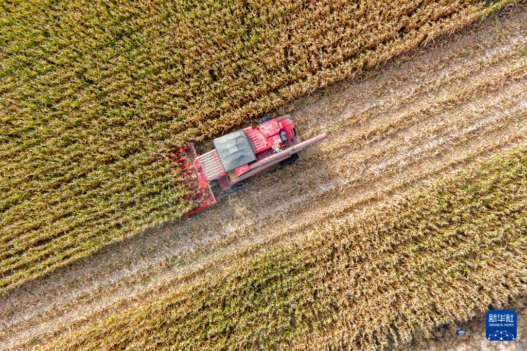 10月15日,在内蒙古巴彦淖尔市乌拉特前旗,农民驾驶农机收割玉米(无人机照片)。新华社记者 马金瑞 摄